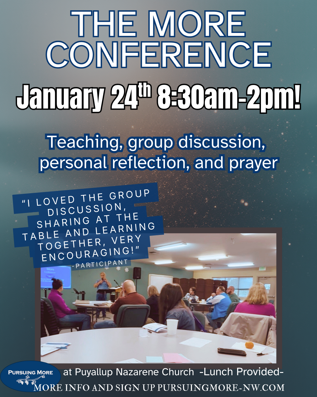 Conference involves: Teaching, small group discussion, personal reflection, group processing, prayer, and more. Beverages, snacks, and lunch provided. (please let us know if you have any dietary restrictions)